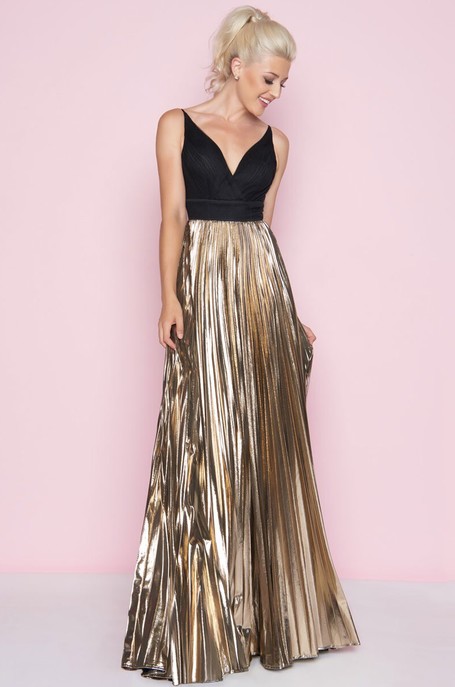Vestido de tirantes con escote en V de tul negro y falda dorada de tablones.