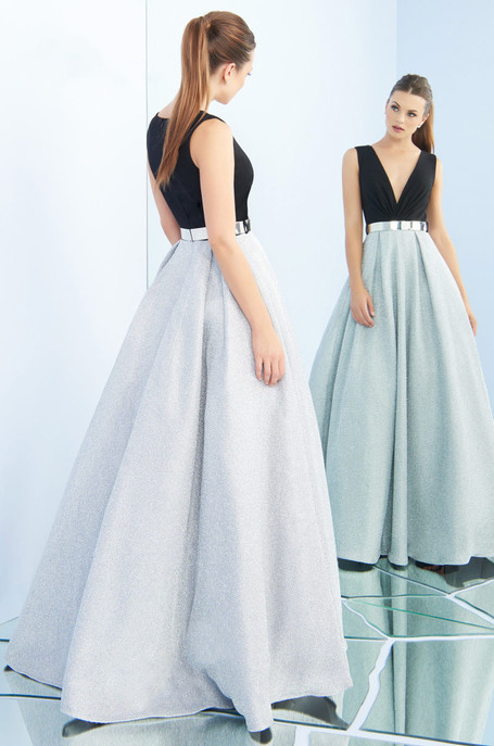 Escote en V plegado con falda de mesh metálico en corte A y cinturón de metal plateado.