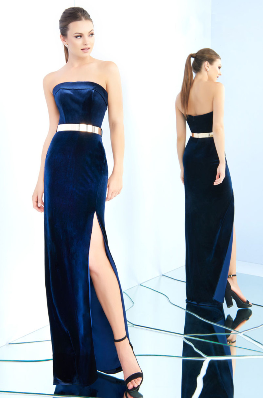 Strapless de terciopelo azul con abertura en la pierna y cinturón metálico.