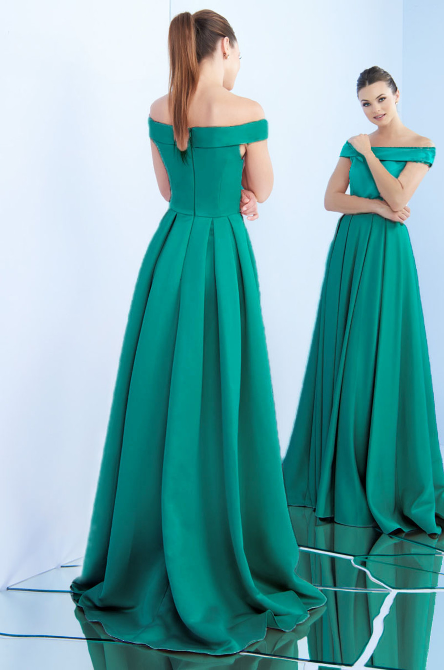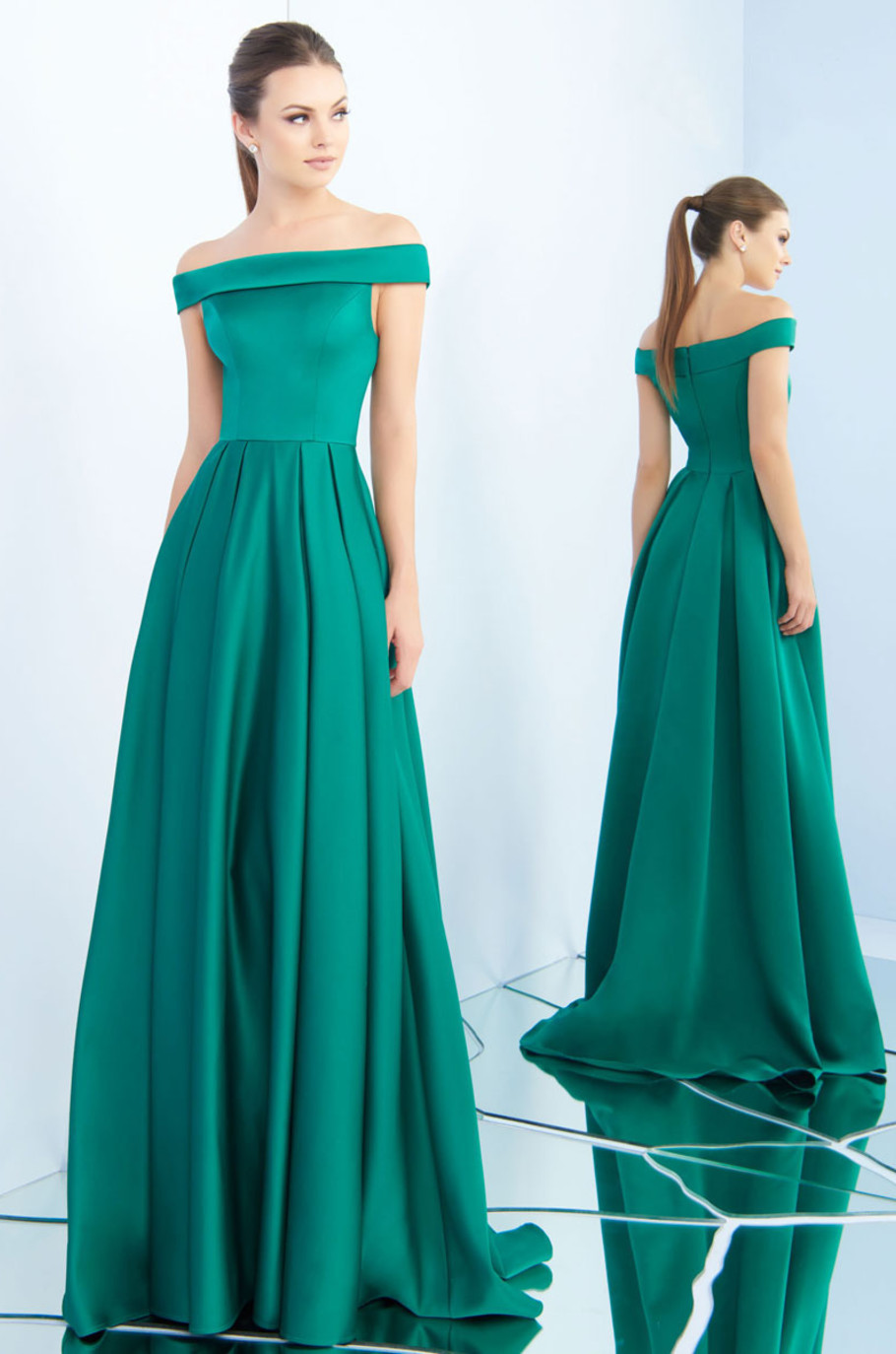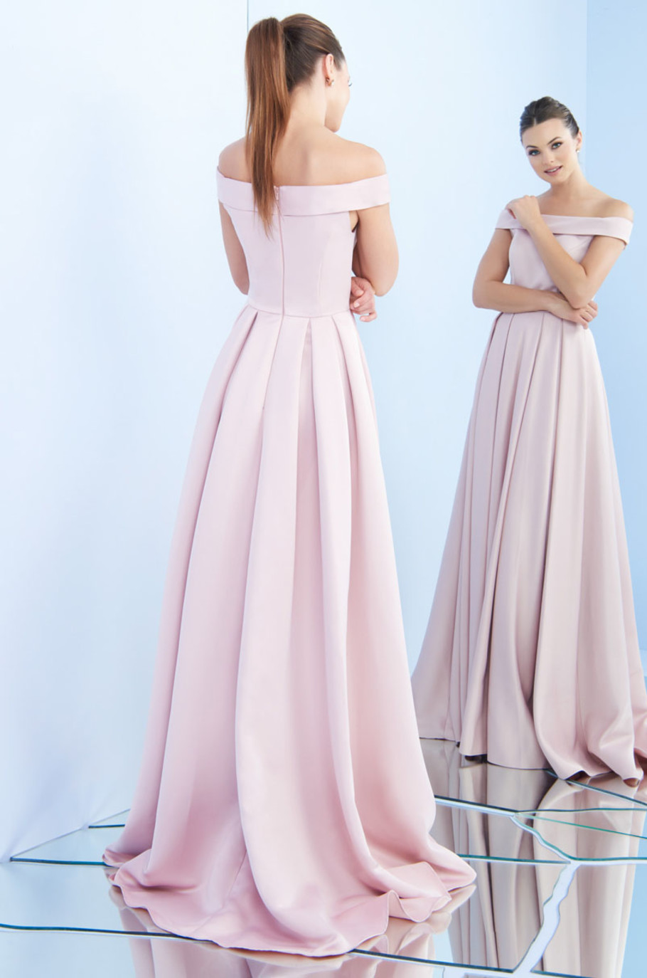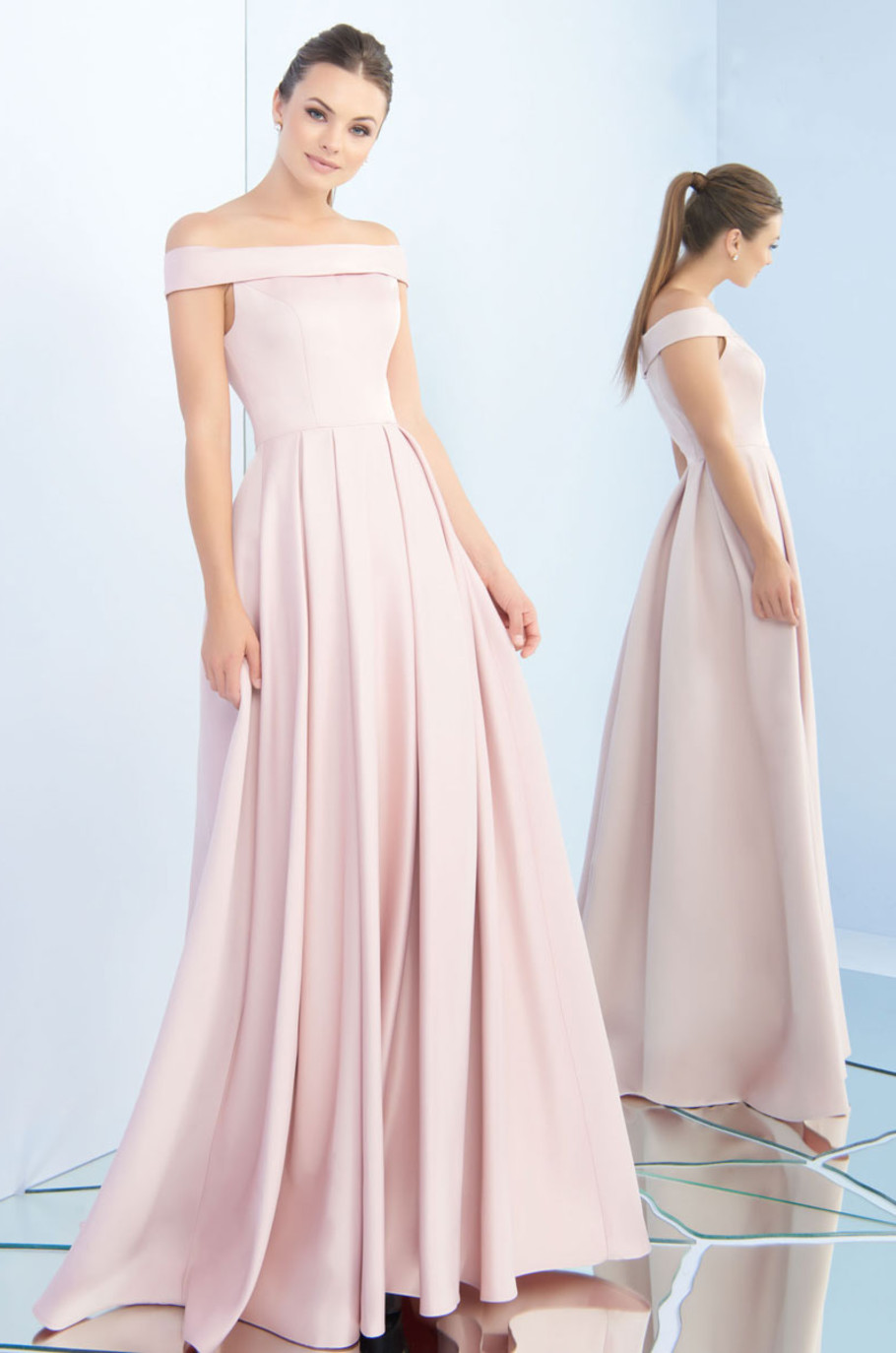 Strapless de satín con falda plisada de corte A y escote bardot.