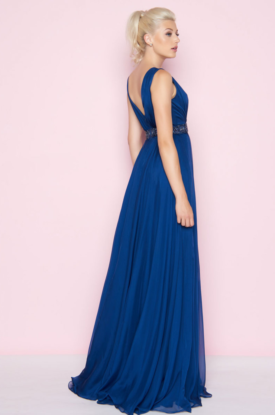 Vestido de chifón con escote en V, aplicación en la cintura y abertura en la pierna.