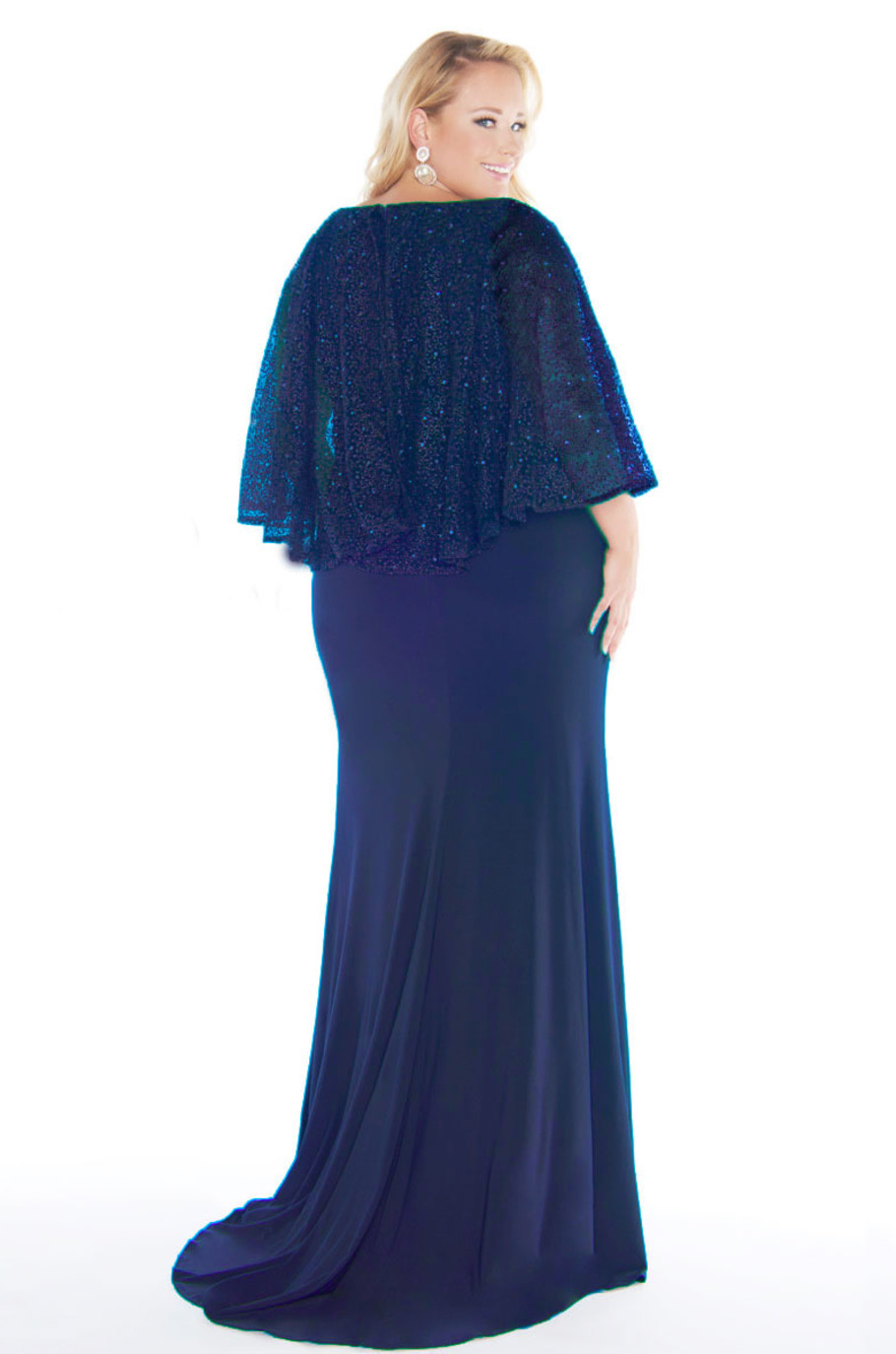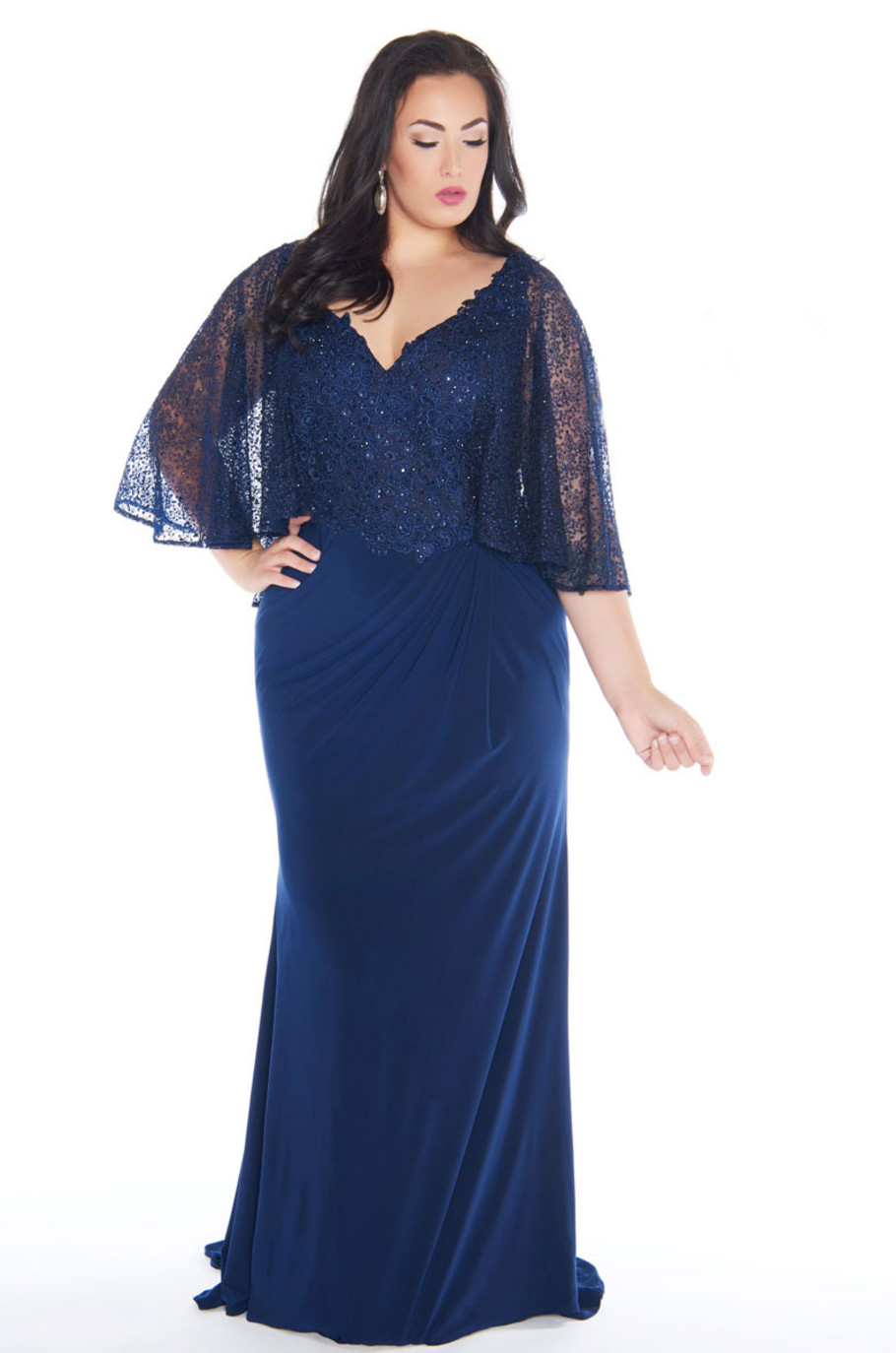Escote en V con mangas estilo capa, detalle de bordado con pedrería y una pequeña cauda.
