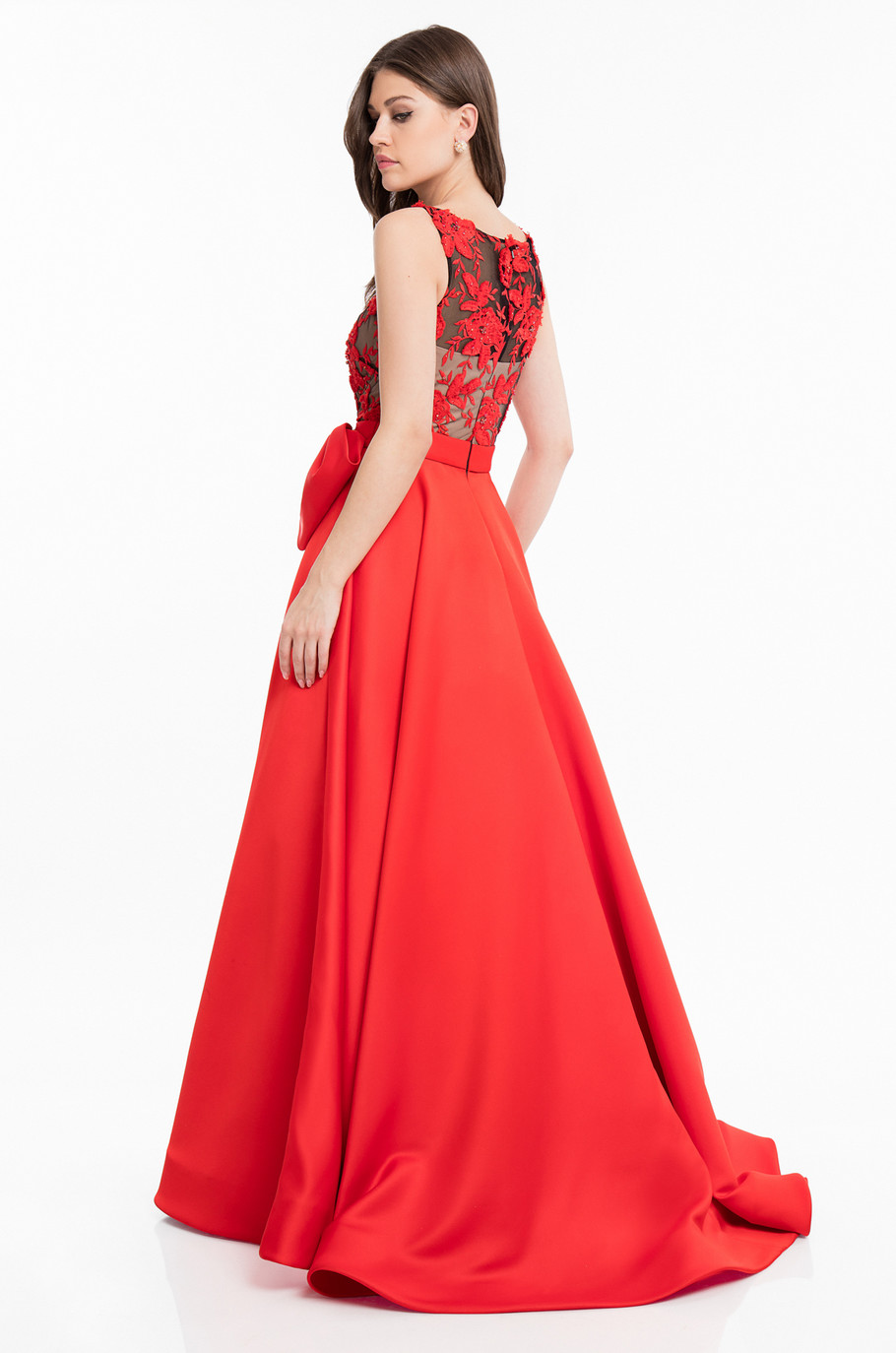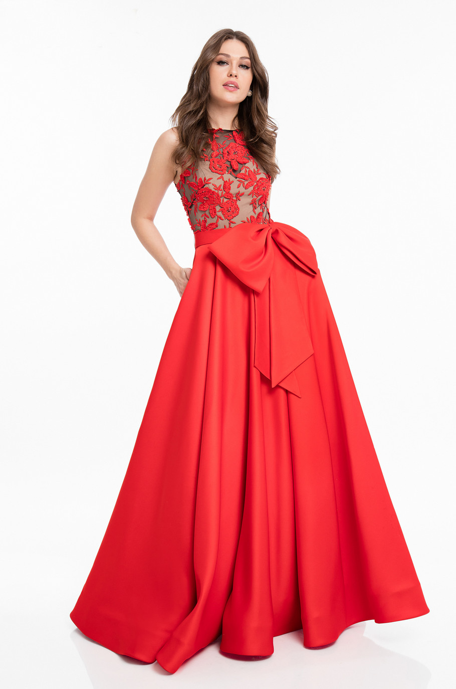 Vestido de satín duchesse en corte A con transparencia y bordado en el corset, moño en la cintura y bolsillos.