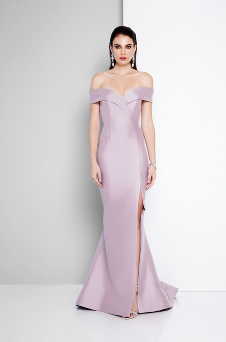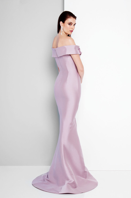 Vestido de Mikado con escote de corazon, hombros descubiertos y abertura en la pierna.